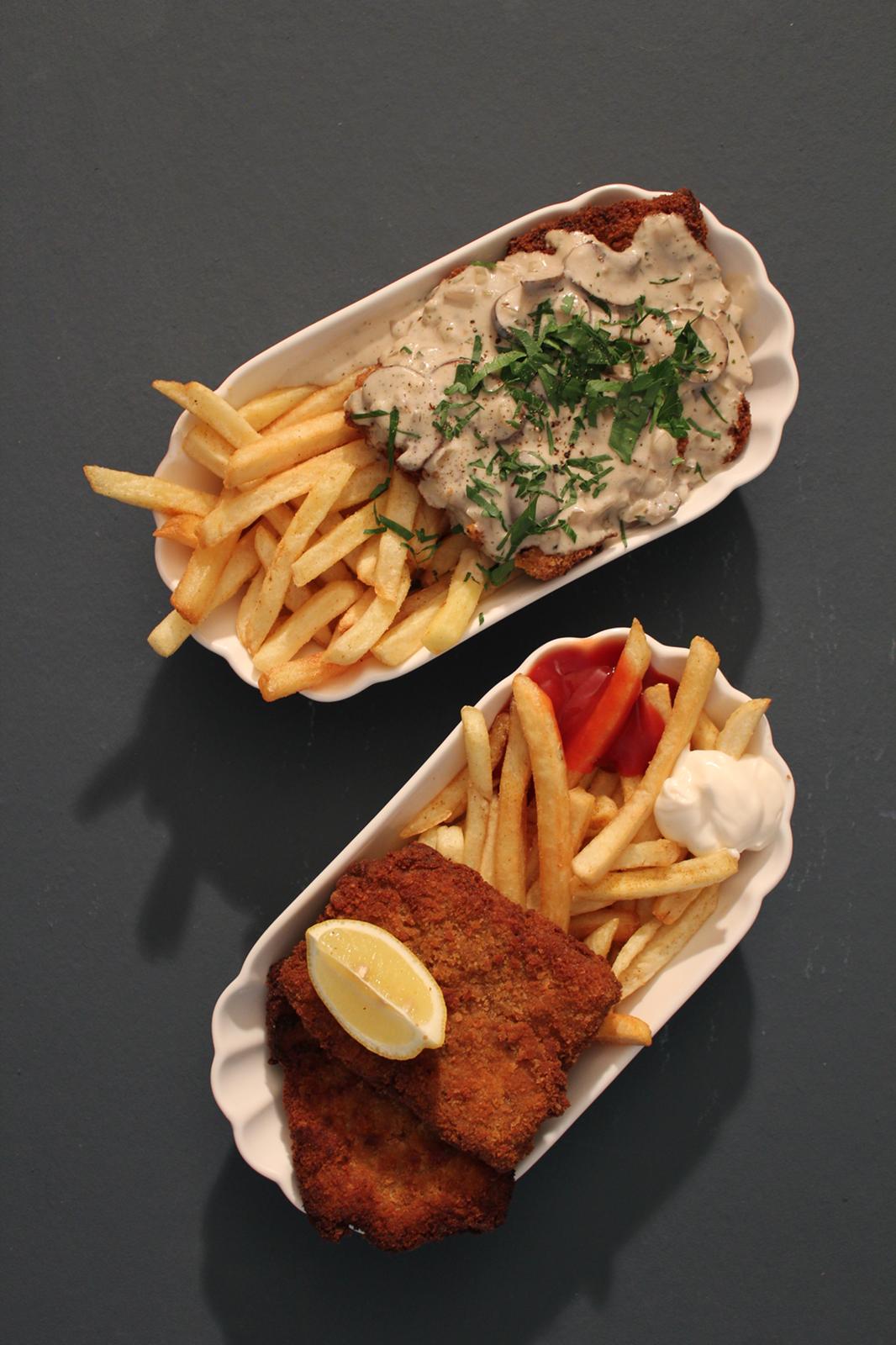 Sojaschnitzel mit Pilzrahmsoße 12,90€ Allergene: Weizen, Soja | Sojaschnitzel mit Pilzrahmsoße und Bio-Pommes soy schnitzel with creamy mushroom sauce and organic fries |